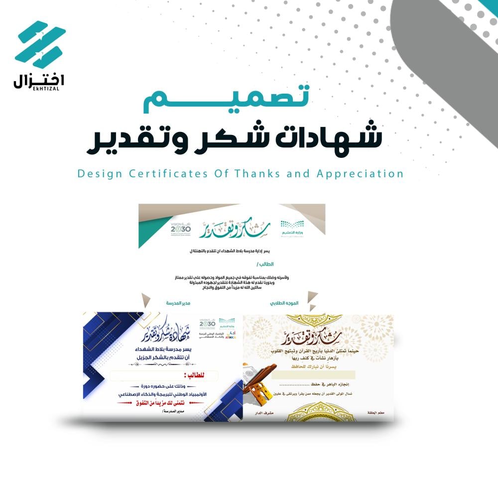خدمة تصميم شهادات شكر وتقدير مقدمة من مؤسسة اختزال للتسويق والتصميم، وهي باقة احترافية لإنشاء شهادات جاهزة للطباعة أو الاستخدام الرقمي، تعكس تقديرك للطلاب، الموظفين، أو المشاركين في أي نشاط أو فعالية.